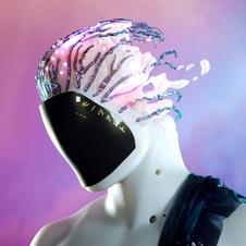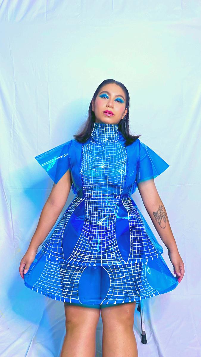 El diseño esta hecho con materiales no convencionalescomovinilotransparenteteñido azulytirasdeplásticoparadarunafiguracónica enlaparteinferiordelvestuario.Inspiradoenla IAsediseñoyefectuóunailustraciónmanualcon tintablancadecaligrafía.