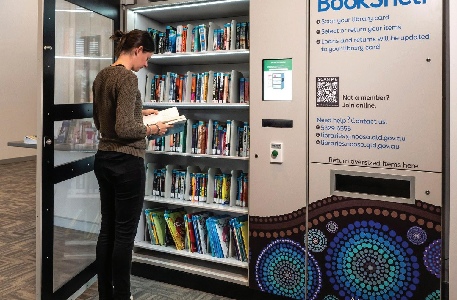 The self-service kiosk is an outreach of the Noosa Library system designed to provide on the spot access to popular and recently published fiction, non-fiction and junior books.Thekiosk will also accept Noosa Library Service items for as returns for those who are not able to make it into a normal branch.