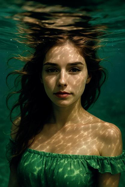 • Promienie światła przenikają przez powierzchnię wody i tworzą na ciele i twarzy modelki migoczące refleksy świetlne