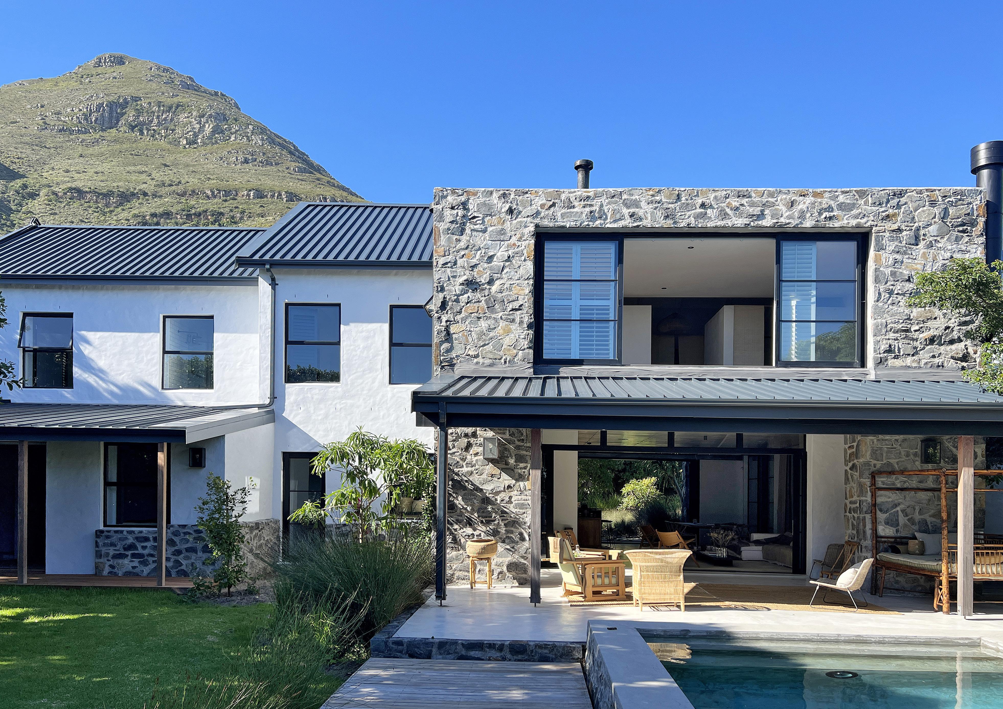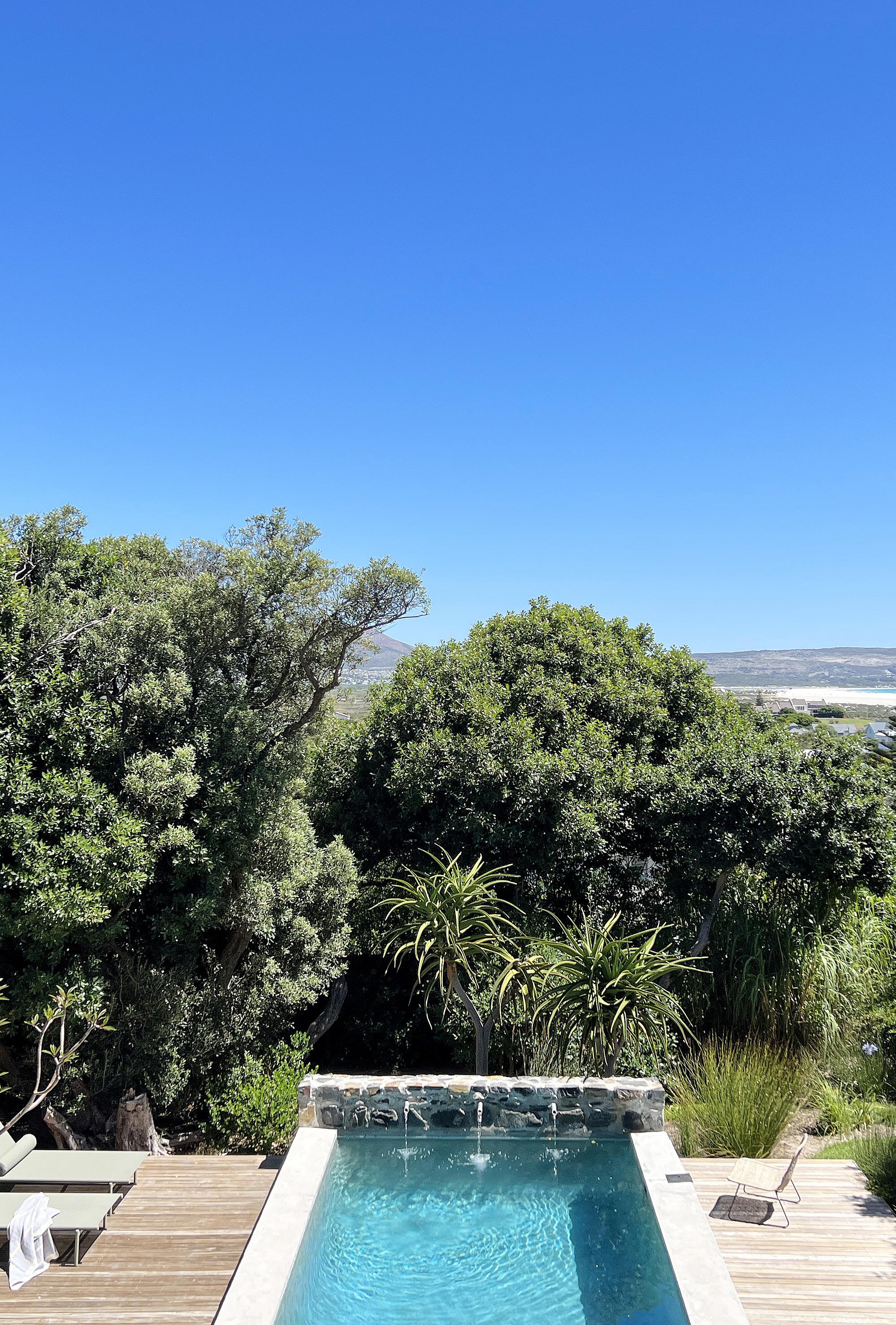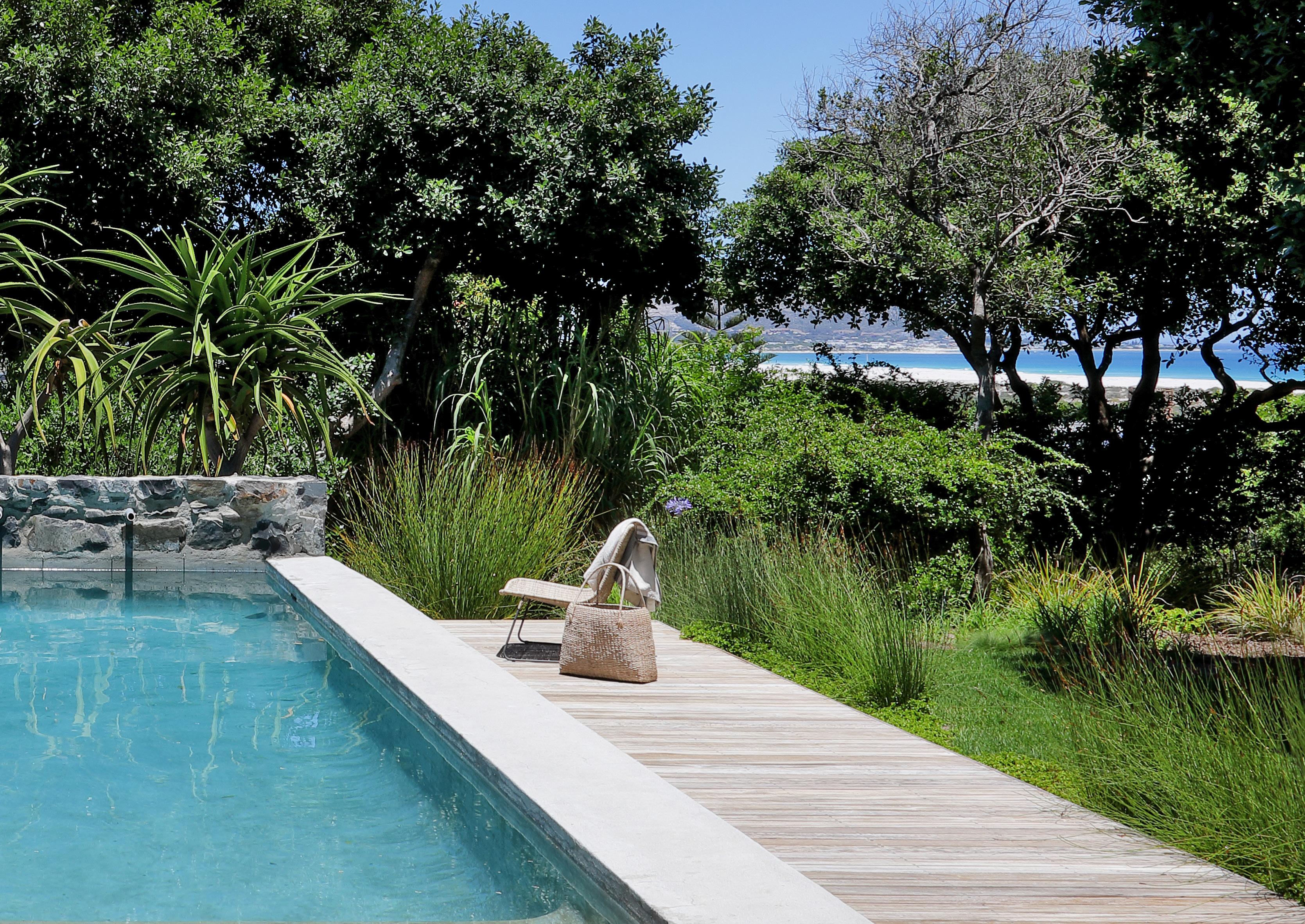Settled down one of the old farm lanes, no more than a five-minute walk from the endless stretch of glorious, scarcely populated beach, tucked into the natural fynbos of the SANParks Nature Reserve, resting beneath the ancient milkwood trees, Pinebeach discreetly peeps out of the verdant landscape, looking up towards the mountains and all the way out to sea. Set on two voluminous levels of polished white and exposed stone walls, tall glass industrial doors and windows, comfy, laidback furnishings and quirky African statements of art, sculpture and design are held together gracefully by the integrity of the architecture. Six spacious ensuite bedrooms dart themselves down long, flowing corridors, that rest above the helm of the home where the open-plan kitchen, living, entertaining and dining space opens out onto a shaded verandah overlooking the beautiful garden and swimming pool. The layers of texture and use of natural materials all blend in harmoniously with the property’s environment allowing the natural light and spectacular views of the landscape to encompass every space.