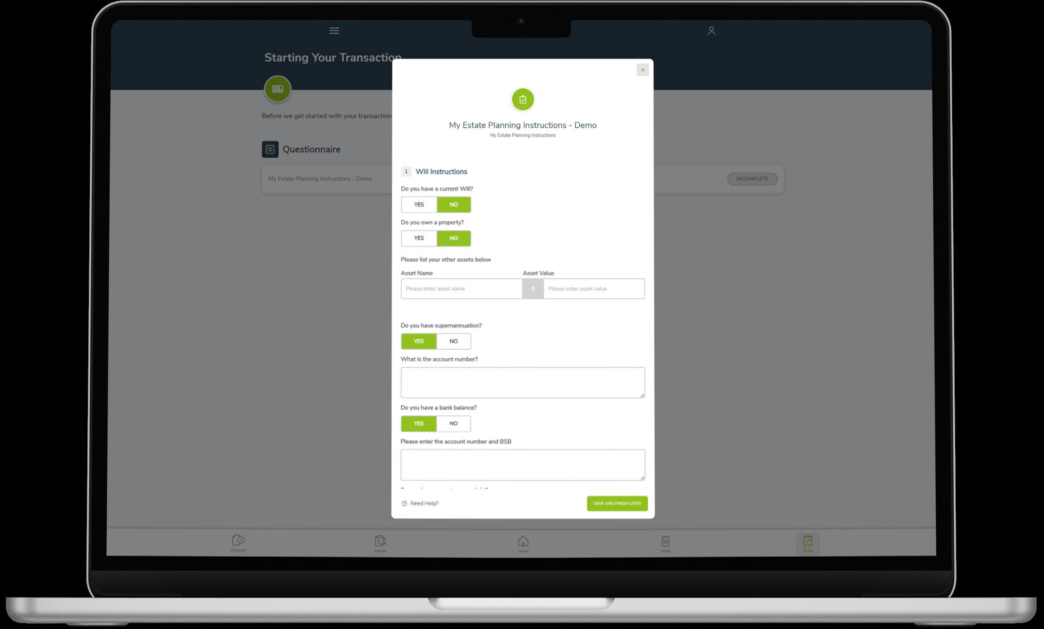 These questionnaires have been designed to be completely flexible and easy to use. Your potential clients can start to fill in the form via your branded app or desktop from the comfort of their home or on the go, at a time that works best for them. No more lengthy phone calls or meetings in the office to extract the information you need.