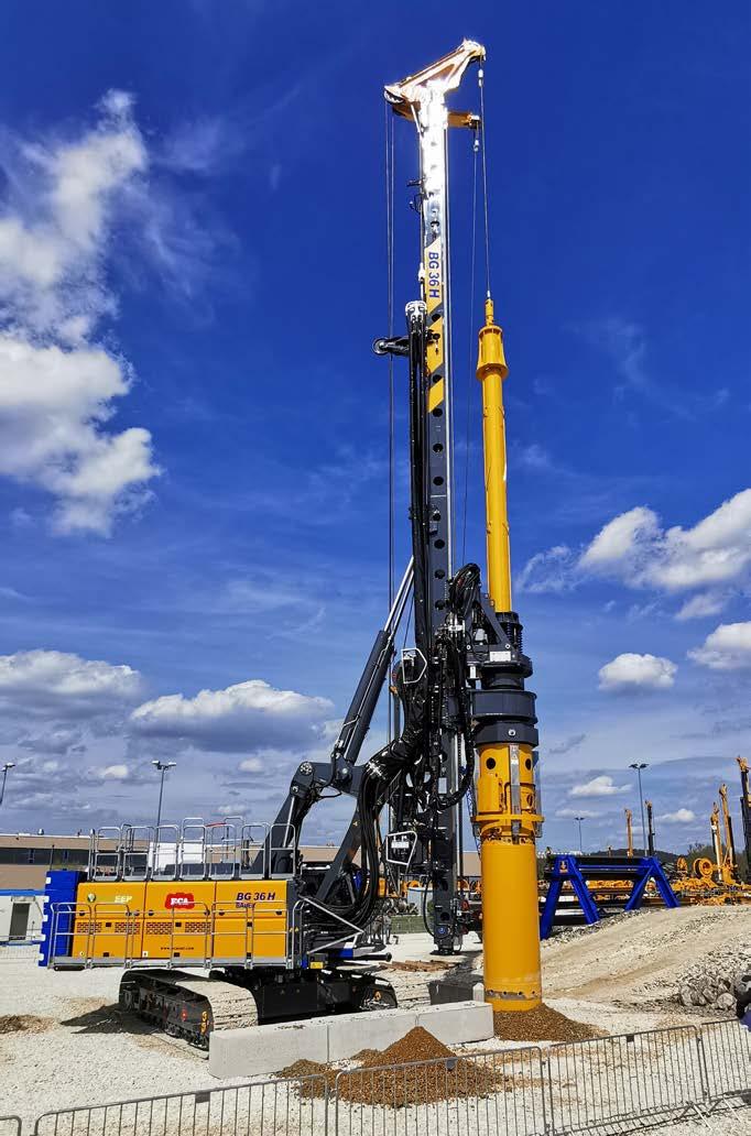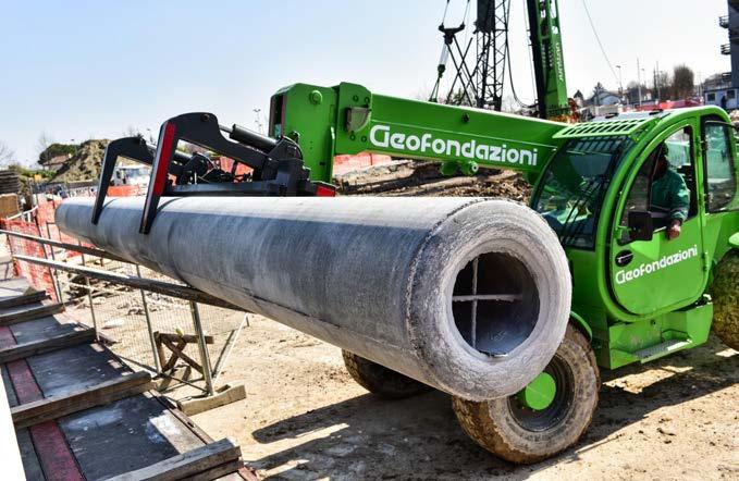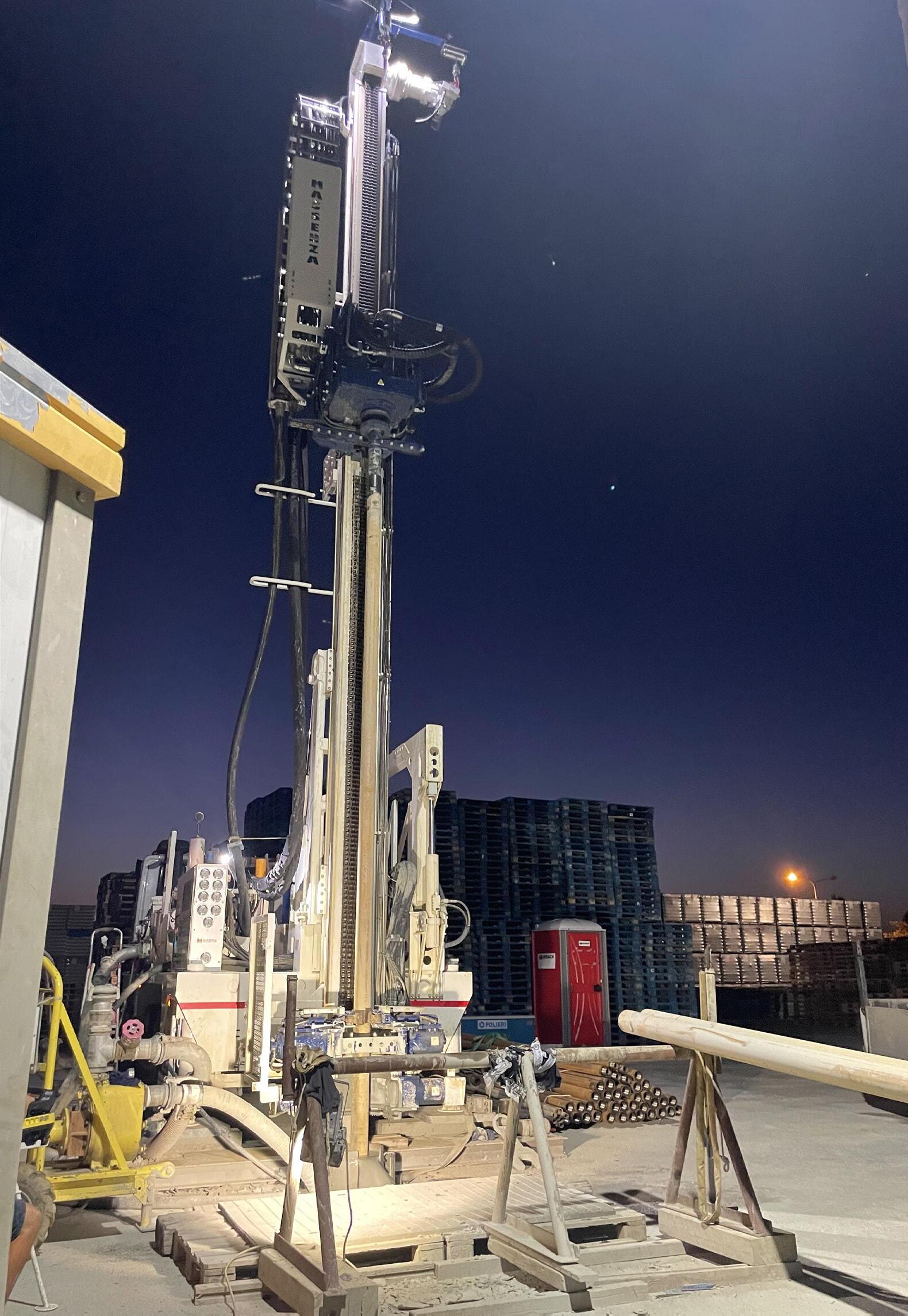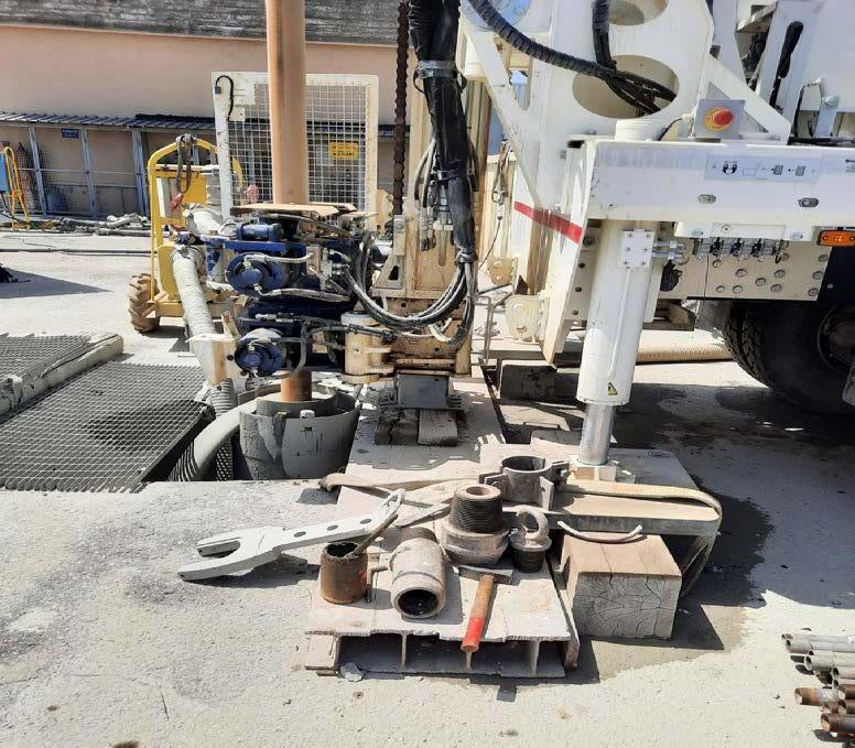 su un comodo treppiede. Questo dettaglio ergonomico ha permesso al perforatore di potersi posizionare nella zona di migliore visibilità e di ripararsi dal caldo di luglio (mese deputato all’avviamento del cantiere di Ravenna e, in questo 2023, contraddistinto da temperature particolarmente elevate). Una menzione tecnica specifica va riservata al caricatore automatico delle aste di perforazione, dotato di braccio e montato a bordo della macchina completo di scatola: permette di trasportare direttamente con la perforatrice ben 198 m di aste, per un sistema che rende le operazioni di cambio per questi componenti estremante semplici, veloci e sicure. Una volta finite le aste a bordo, poi, il sistema di basculamento della testa di rotazione permette di continuare il lavoro senza sforzi, semplicemente posizionando le aste ulteriori su due supporti davanti al pozzo.