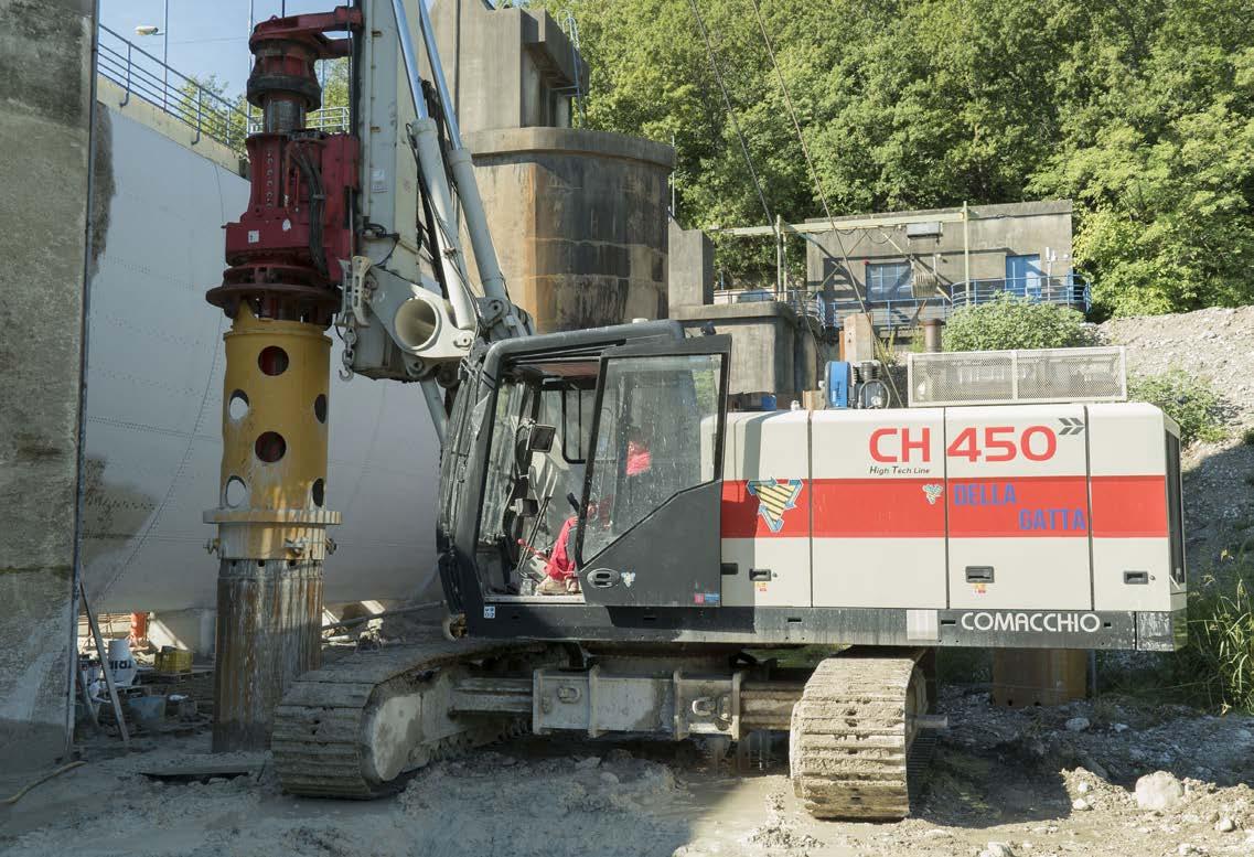 Per soddisfare i requisiti del progetto e garantire la stabilità dell’argine durante lo scavo, Treviicos, grazie allo spirito pioneristico tipico del gruppo, ha proposto e installato diaframmi impermeabili plastici utilizzando una miscela auto indurente (SHS) con la tecnologia dell’idrofresa. Con questa soluzione, la boiacca, una miscela ingegnerizzata composta da acqua, cemento, bentonite ed additivi, funge sia da supporto allo scavo che da riempimento permanente. Lo scavo è stato generalmente eseguito ricorrendo a una combinazione di benne mordenti meccaniche e idrofresa. La prima scavava gli strati di terreno più “morbidi”, mentre la seconda, generalmente montata su una gru da fondazione Soilmec SC-120, interveniva in presenza di quelli più resistenti, incluse bancate di calcare caratterizzate da una resistenza fino a 14,000 kilo pascal, ed inoltre garantiva il rispetto dei requisiti di verticalità e continuità per il diaframma. La riabilitazione ha previsto anche l’installazione di un diaframma impermeabile plastico mediante la tecnologia del jet grouting (JGCOW) per sigillare le aree adiacenti alle strutture in calcestruzzo preesistenti (chiuse, traverse, ecc.). Per questo scopo Treviicos ha utilizzato una combinazione di tecniche di pre-foro e jet grouting. Il pre-foro, generalmente eseguito con una perforatrice Soilmec SR-75 dotata di elica continua, è servito a frammentare gli strati di calcare duro lungo l’allineamento del diaframma, mentre il jet grouting è stato eseguito per creare il diaframma richiesto utilizzando una Soilmec SR-30 configurata con sistema jet grouting mono-fluido.