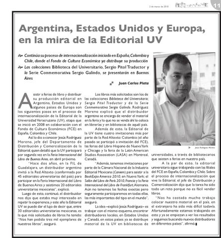 sistir a ferias de libro y distribuir su producción editorial en Argentina, Estados Unidos y algunos países de Europa son los siguientes pasos en el proceso de internacionalización de la Editorial de la Universidad Veracruzana (UV), etapa que se inició en 2008 en colaboración con el Fondo de Cultura Económica (FCE) en España, Colombia y Chile. Así lo dio a conocer Jesús Rodríguez Moreno, jefe del Depar tamento de Distribución y Comercialización de la Editorial, quien detalló que la UV participará por segunda vez en la Feria Internacional del Libro de Buenos Aires, en abril próximo. “Hace dos años, en la FIL de Guadalajara, un distribuidor argentino invitó a la Red Altexto (conformada por 45 editoriales universitarias del país) para participar en la Feria Internacional del Libro de Buenos Aires y asistimos 20 editoriales universitarias mexicanas”, explicó. Luego de esto, continuó, el distribuidor nos dijo que estaba muy interesado en repetir la experiencia, y este año la Editorial UV se puede dar el lujo de decir que, entre 30 editoriales universitarias mexicanas, es la que más solicitudes de libros ha tenido: “Nos han pedido tres mil ejemplares de nuestros libros”, aseguró.