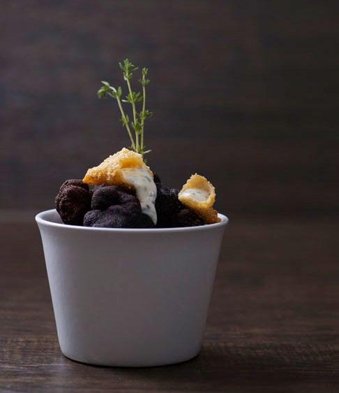 2. Saute potato, thyme and add in the cream. Simmer till it is creamy. Monter with Butter and add in truffle oil. Add seasoning, chopped black truffle, and mix well. Let the mxiture cool completely.