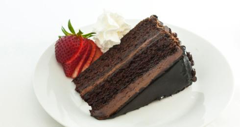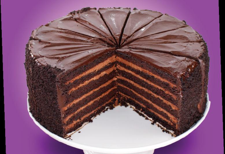 Four rich, dark chocolate, melt-in-your-mouth cake layers are stacked high with alternating layers of decadent chocolate frosting. Since there can never be too much chocolate, this cake is topped with generous amounts of delicious chocolate shavings. 14 slices.