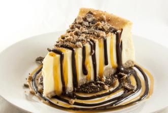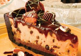 Our famous crunchy peanut butter filling and chopped REESE’S® Peanut Butter Cups are put into a rich chocolate crust and drizzled with HERSHEY’S® fudge and HERSHEY’S® caramel. 8 slices.