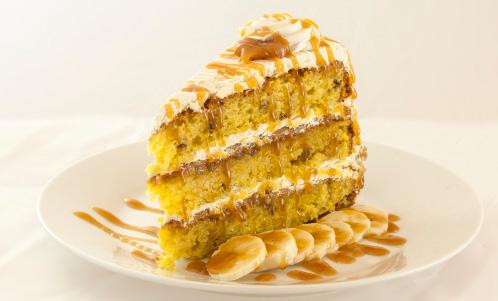 A new spin on an old flambé favorite. Three luscious banana flavored cake layers encased in layers of gooey caramel and banana flavored frosting. 14 slices.