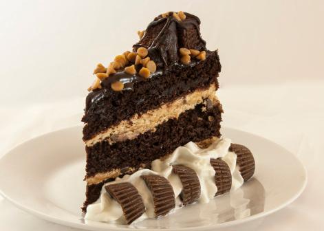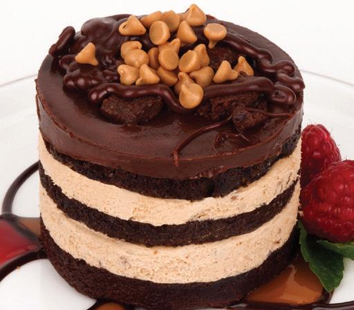 Copious amounts of peanut butter flavored frosting cover two of the three rich dark chocolate cake layers, while a silky chocolate frosting covers the top layer. Peanut butter chips AND a brownie adorn the top of this monument to chocolate and peanut butter. 14 slices.