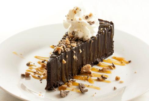 Alternating layers of chocolate cake, caramel marshmallow cream, and nougat mousse, finished and iced with chocolate fudge, caramel marshmallow crème, and mini chocolate curls. 14 slices.