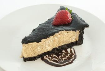 Creamy peanut butter mousse and silky milk chocolate fill a chocolate cookie crust and are topped with chocolate, caramel, peanut butter cups and decadent peanut butter drizzle.