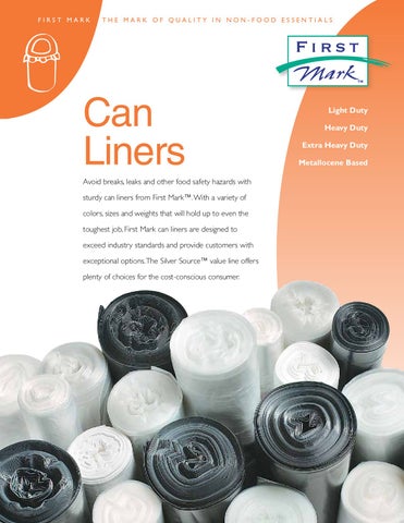 Can Liners Avoid breaks, leaks and other food safety hazards with sturdy can liners from First Mark™. With a variety of colors, sizes and weights that will hold up to even the toughest job, First Mark can liners are designed to exceed industry standards and provide customers with exceptional options. The Silver Source™ value line offers plenty of choices for the cost-conscious consumer.