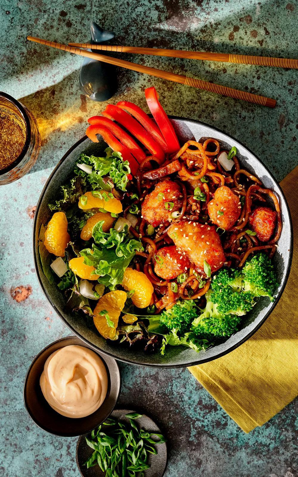 In your serving bowl put noodles in one half or side of the bowl and Arcadian blend on the other side or half of the bowl. Top with warm Thai chicken. Fan red bell pepper along one side of bowl. Arrange the broccoli, onion and mandarin oranges in the bowl. Drizzle with Sriracha Mayo dressing. Garnish with sesame seeds and green onions then serve
