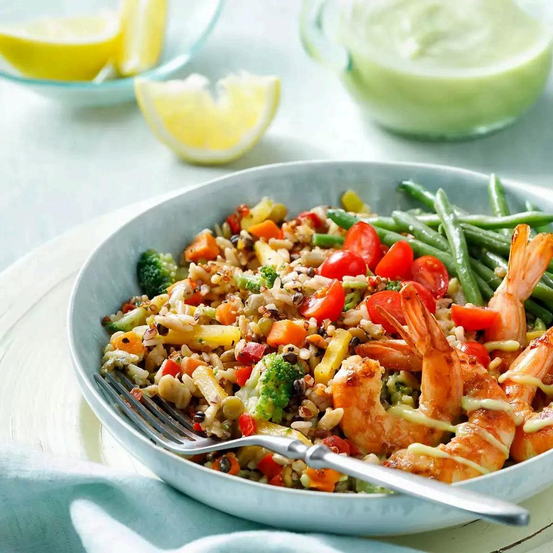Grilled Shrimp Mediterranean Bowl brings together hearty whole‐grain orzo, red quinoa, crisp vegetables, and warm grilled shrimp, all brightened with Mediterranean flavors like olive oil, lemon, and creamy avocado. It’s a fresh, flavorful bowl that delivers delicious simplicity.