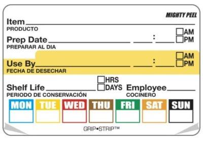 Removable food rotation labels feature a semi‐gloss finish and mild removable adhesive. These popular labels remove completely from containers before washing without leaving any residue.