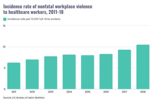 Three in four healthcare workers have encountered both verbal and physical assaults in the same month, and nearly half of workers needed to call for security or another coworker to assist. The vast majority 92 percent of violent incidents involve patients or other customers such as family members.
