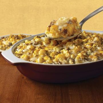 Hash brown potatoes are combined with an indulgent cheese sauce and topped with a dash of cornflake topping for the perfect crunch. Product is frozen in convenient half-pan trays and ready to simply cook and serve.