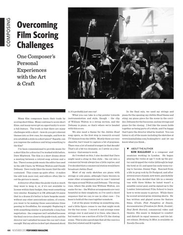 Many film composers learn their trade by scoring short films. Many continue to score short films, and many never get an opportunity to score a full feature. The truth is that there are many challenges with a short – how do you get coherent themes into so few cues, for example, and how do you establish a style in a short piece? Equally, can you impress the audience and bring something to the film? I’ve been commissioned to provide music for a short film for a director I’ve worked with before, Dave Maybrick. The film is a short drama about a meeting between a retired soap actress and a fan. There’s some guide music the editor has used in the edit I have, by William Walton and Claude Debussy. Dave really likes the music that the edit contained. This comes up quite often - it makes the edit look more real, and editors often like to cut the picture to music. A director often likes the guide track so much they want to keep it, or, if it’s not available to license within their budget, they want something very similar. Keeping it is OK although I’d argue that in a drama it’s better to have bespoke music without any other associations unless, of course, you want to be making those associations (time passing in Goodfellas, for example). Replacing it with something similar is potentially a lose/lose negotiation - the composer isn’t satisfied because the final cue is too close to the guide track, and the director isn’t satisfied because the cue isn’t close enough! But my advice is don’t get obsessed about 44 NOVEMBER 2013 PERFORMER MAGAZINE