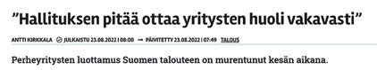 Kun vielä toukokuussa – kolme kuu kautta Venäjän hyökkäyksen jälkeen –usko Suomen talouteen pysytteli sotaa edeltävällä tasolla, kesän aikana luot tamus on murentunut. Viiden pisteen paremmalta puolelta (asteikolla 1-10) vastausten keskiarvo on luisunut 3,8 pisteeseen.
