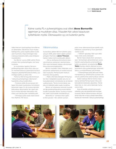 Vallila Interiorin toimitusjohtaja Anne Berner on tahtonainen. Siitä kertoo muun muassa kädenpuristus, jonka napakkuudesta kuulee usein huomioita. Onpa toimittajien kokemuksia puristuksesta lisätty usean lehtijutun mausteeksikin. Kun Berner vuonna 2008 valittiin Perheyritysten liiton puheenjohtajaksi, hän halusi muutosta. Ja muutostahan tapahtui. Bernerin puheenjohtajuuden aikana liiton näkyvyys on moninkertaistunut, jäsenmäärä kasvanut reippaasti, järjestöyhteistyötä tiivistetty, uusi strategia laadittu ja vaikka mitä. Mutta kun Berneriä pyytää kertomaan ”väistyvän puheenjohtajan näkemyksiä”, haastattelu uhkaa tyssätä siihen. – Fokuksen pitää olla seuraavaan johtajaan liittyvässä muutoksessa menneeseen katsomisen sijaan. En ole innokas käymään keskustelua väistymisestä. Sen sijaan olen hyvin innokas käymään keskustelua siitä, mitkä ovat tulevaisuuden mahdollisuudet. – Omistajuus pitää saada osaksi kansallista ohjelmaa, hän lausuu.