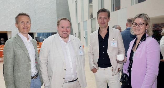 Perheyritysvaltuuskunnan kokoustauolla kävi vilkas keskustelu, vasemmalta: Simo Valtti, Ville Mäkinen, Aleksi Uusitalo ja Noora AroTuominen.