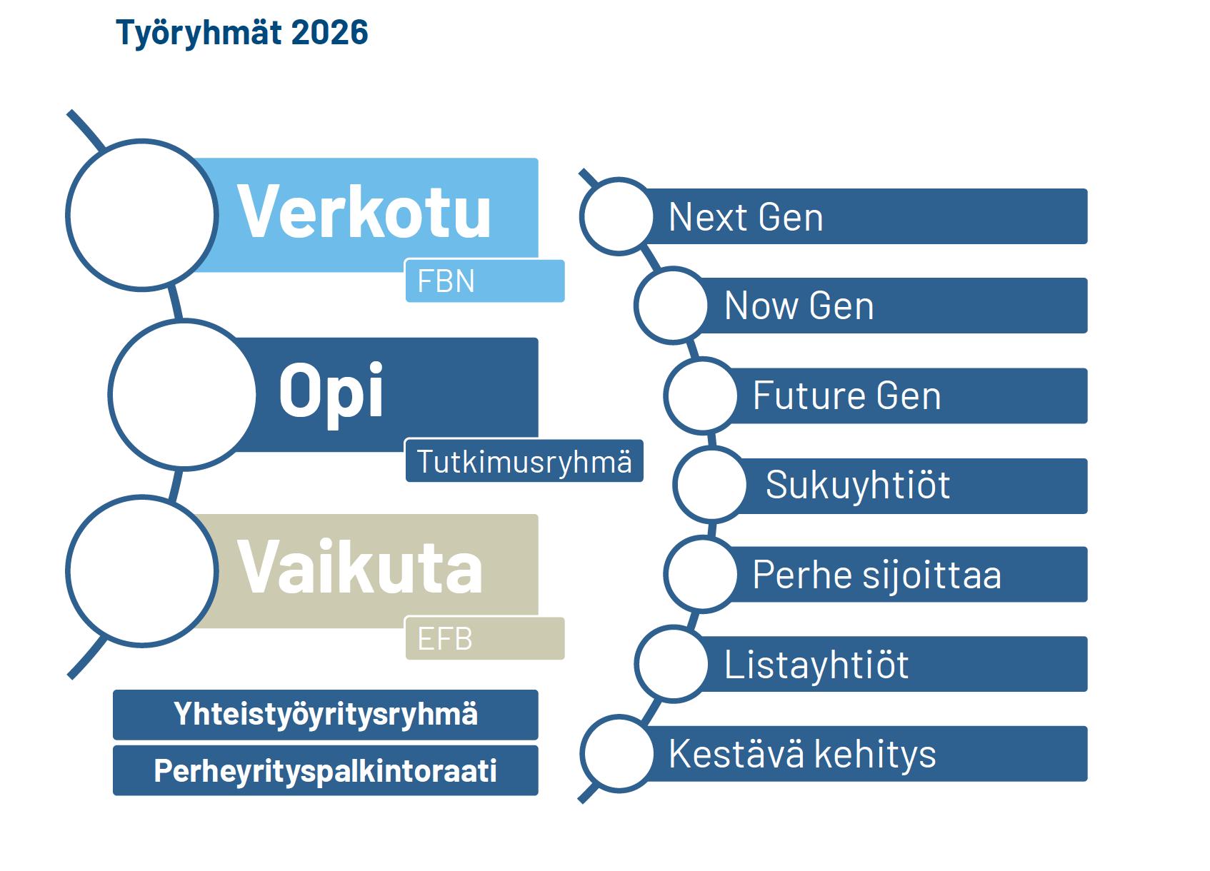 Next Gen -työryhmä. Next työryhmän tehtävänä on toiminnan suunnittelu nuorille perheyritysten jatkajille. Toiminta on tarkoitettu kaikille täysi-ikäisille Nexteille, jotka ovat mukana yrityksen toiminnassa, opiskelevat tai vielä pohtivat rooliaan perheyrityksessä.
