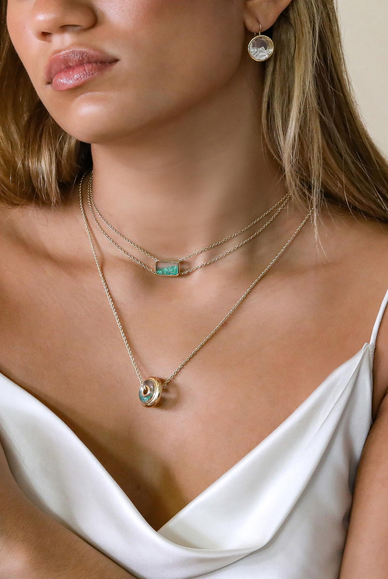 MORITZ GLIK creates his unique kaleidoscope Shaker jewelry in his studio in New York City. This signature technique encapsulates shimmering full-cut gems within white sapphire windowpanes and 18-karat gold.