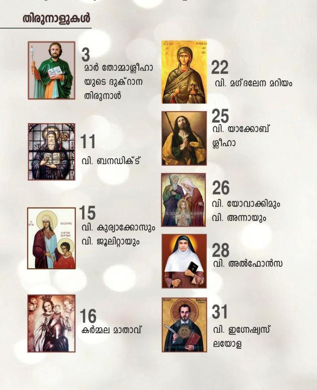July 3: മോർശെോമോശ്ലീഹോയ്കുട്ടെദുക്റോനതിരുനോൾ July 16: കർമ്മലമോതോവിട്ടെതിരുനോൾ July 26: വി.ശ ോവോകീംഅന്നോയ്കുട്ടെയ്കുംതിരുനോൾ July 28: വി.അൽശഫോൻസോമ്മയ്കുട്ടെതിരുനോൾ August 1: രതിഞ്ച്ശനോപ്ആരംഭം August 4: വി.ശ ോൺമരിയ്കവിയ്കോനിയ്കുട്ടെതിരുനോൾ August 6: നമ്മുട്ടെ കർെോവിട്ടെ രൂരോന്തരീകരണ തിരുനോൾ August 15: രരിശുദ്ധ് കനയക മറിയ്കെിട്ടെ സവർഗോശരോഹണതിരുനോൾ ഇന്തയൻസവോതപ്ന്തയദിനം August 29: വി.ഏവുപ്രോസയമ്മയ്കുട്ടെതിരുന്നോൾ September 1: എെുശനോപോരംഭം September 5: ട്ടകോൽകെയ്കിട്ടലവിശുദ്ധ്ട്ടതശരസയ്കുട്ടെ തിരുനോൾ September 8: രരി.കനയകോമറിയ്കെിട്ടെ നനെിരുനോൾ September 14: രരി.കുരിശിട്ടെരുകഴ്ച്േയ്കുട്ടെതിരുനോൾ September 27: വി.വിൻട്ടസെ്േിശരോളിട്ടെതിരുന്നോൾ September 29: മോലോഖ്മോരോയ്കവി.മിഖ്ോശയ്കൽ, ഗപ്ബിശയ്കൽ, റഫോശയ്കലിട്ടെതിരുന്നോൾ September 30: വി.ട്ടകോച്ചുശപ്തസയയ്കുട്ടെതിരുന്നോൾ 7 ജൂലൈ 2023 “ഇനിമുതൽമൂന്ന്മോസംകൂടുരപോൾആയി ിക്ും നമ്മുടടഇടവകയുടടബുള്ളറ്റിൻ പുറത്തിറക്ുന്നത്.”
