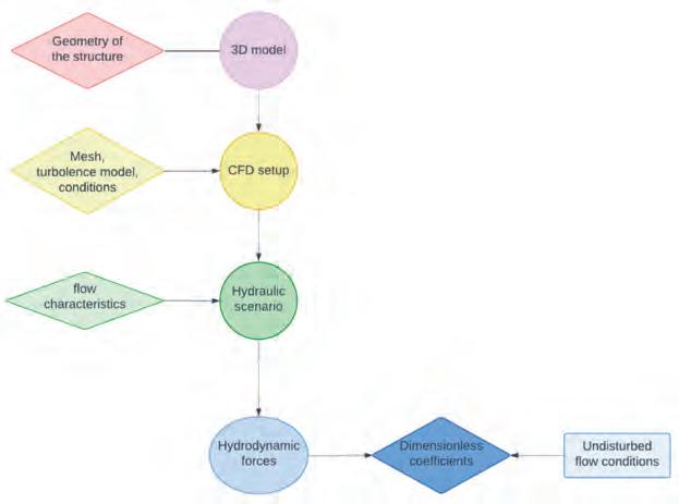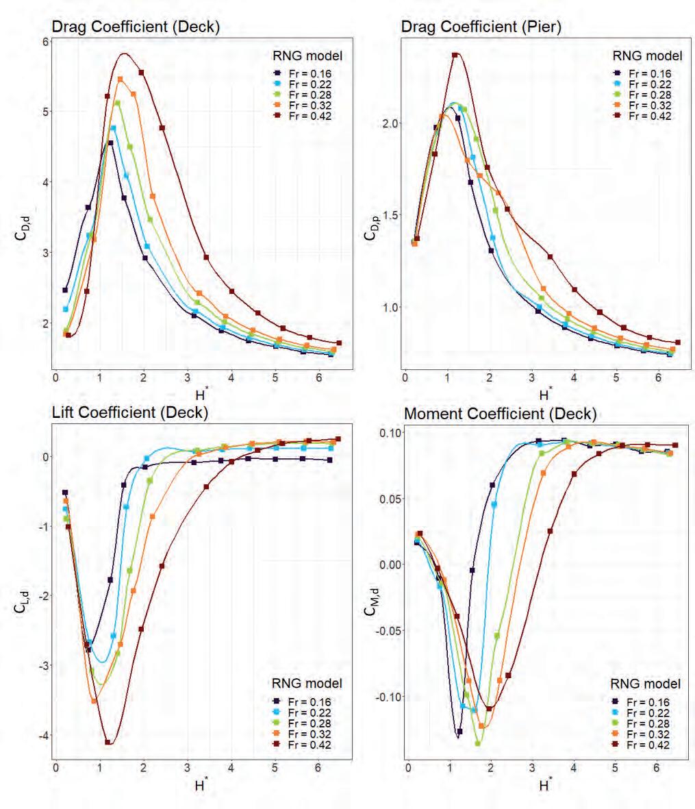 vo valido per l’analisi dei carichi idrodinamici attesi sui ponti in caso di sormonto o di riduzione del franco idraulico di progetto. Il campo di moto tridimensionale intorno al ponte è stato investigato utilizzando la modellistica numerica CFD e adottando vari modelli di turbolenza (RNG, κ − ω). I coefficienti adimensionali delle forze di resistenza, portanza e del momento ribaltante vengono stimati in funzione delle caratteristiche della corrente in condizione indisturbata. Il modello CFD (implementato ricorrendo al software FLOW-3D®) è stato dapprima calibrato su misure sperimentali di letteratura ottenute nel caso di presenza di accumuli di materiale legnoso intorno alle pile (aventi forma circolare, ad ogiva o semicircolare), variando la porosità e la scabrezza esterna dell’ammasso. Successivamente, è stato validato facendo riferimento alle evidenze sperimentali delle spinte misurate in laboratorio su un impalcato rettangolare, in assenza di trasporto solido. Il modello ottenuto è stato quindi applicato per ottenere curve sintetiche che esprimono i coefficienti da applicare alle forze temibili sugli elementi del ponte (pila ed impalcato) in funzione del rapporto di inondazione (variabile tra 0 e 6) e del numero di Froude (compreso nel range tra 0.16 e 0.42). Tali indicazioni si possono ritenere valide per tutti i ponti aventi la tipologia strutturale analoga a quella esaminata nel presente studio (i.e., impalcato rettangolare e pila circolare).
