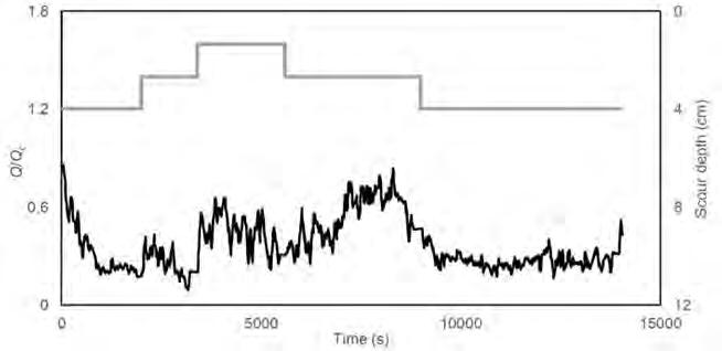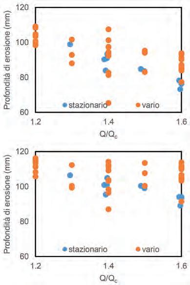 Inoltre, dalle prove preliminari sviluppate, risulta evidente come i valori del massimo scavo risultino ridotti di circa il 25% passando da U/Uc = 0.9 a U/Uc = 0.7. Il valore U/Uc = 0.9 risulta in pratica il massimo raggiungibile senza che le sperimentazioni siano continuamente alterate dalla presenza delle forme di fondo ed è stato per tale ragione mantenuto per tutte le prove sviluppate.