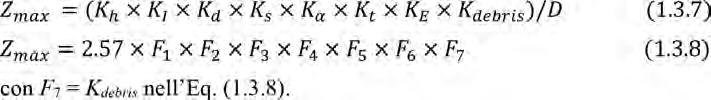 dall’Eq. (1.3.3) assume validità generale nel range dei parametri idraulici e geometrici testati. In presenza di debris, sia il meccanismo erosivo che la sua cinetica si modificano significativamente. Nella fattispecie, il massimo scavo adimensionale Zmax_debris = zmax_debris/D, con zmax_debris che rappresenta il massimo scavo misurato, risultano essere influenzati dalla percentuale di area liquida occupata dal debris medesimo. Nella fattispecie, per tener conto di tale ostruzione, Pagliara e Carnacina (2011) hanno introdotto il rapporto di ostruzione ΔA = 100[(dd – D)td]/(Dh) (espresso in percentuale), ottenendo, per debris di forma rettangolare, la seguente espressione per il fattore correttivo Kdebris: