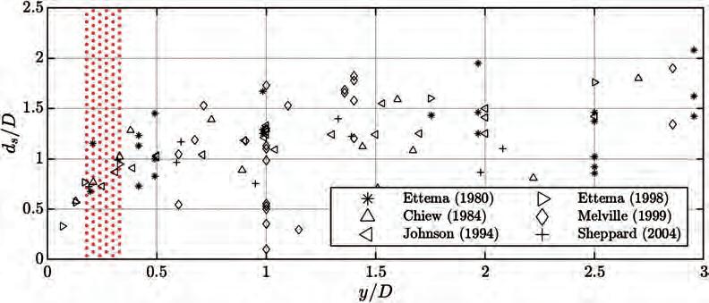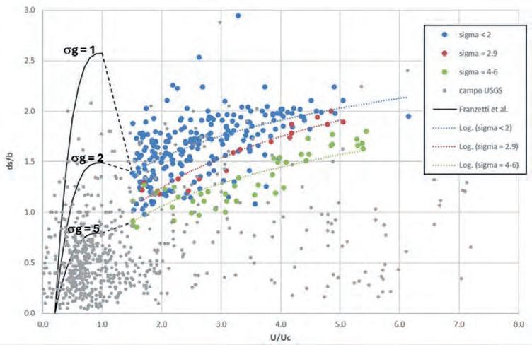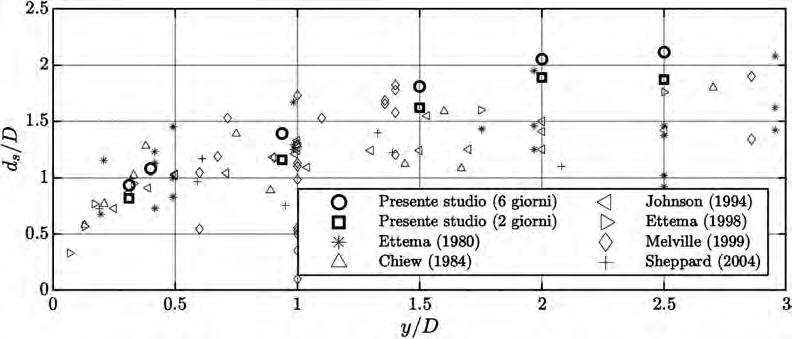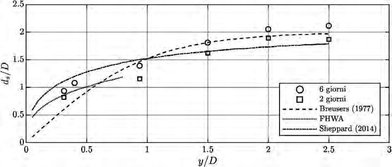 Dal confronto con le più comuni formule previsionali riportate in letteratura (Breusers et al., 1977; FHWA, 2001; Sheppard et al., 2014) risulta evidente come le relazioni di Sheppard e di Breusers forniscano adeguate rappresentazioni per l’inviluppo dei valori dello scavo massimo rispettivamente nei casi y/D < 1 (pila larga) e y/D > 1 (zona di transizione), anche se in questo ultimo caso la previsione fornita risulta in qualche misura sottostimata per i maggiori valori del rapporto y/D (Figura 5.9).