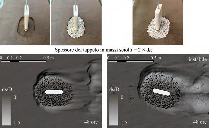 Tuttavia in Italia sono numerosi i casi di vecchi ponti caratterizzati da pile, anche con geometria complessa, le cui fondazioni sono state efficacemente difese dal fenomeno di erosione localizzata utilizzando scogliera con diametri, scalati al reale, non dissimili da quelli utilizzati in laboratorio. Una consolidata procedura prevedeva infatti che dopo il passaggio di una piena di qualche rilievo, venissero lanciati massi dall’impalcato dello stesso ponte attorno alle pile con l’intento di rinforzare la stabilità delle fondamenta. Per essere lo scavo non visibile, per la presenza dell’acqua e perché esso tende a riempirsi in coda alla piena di materiale fine, la quantità dei massi da utilizzare non era tecnicamente definita, ma probabilmente dipendente dalla disponibilità di scogliera. In ogni caso i massi andavano a riempire lo scavo af-