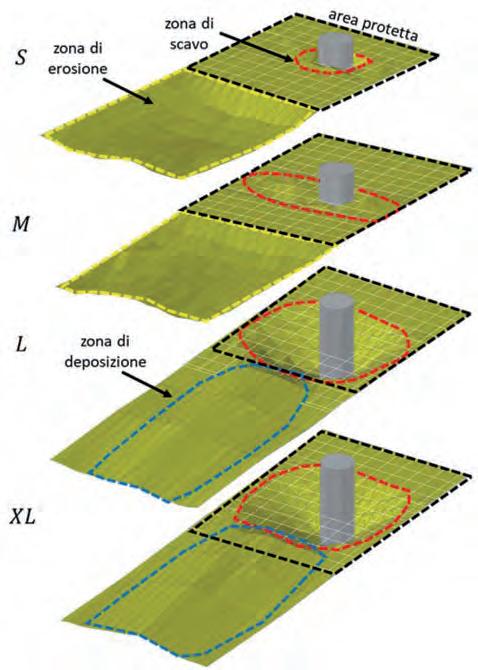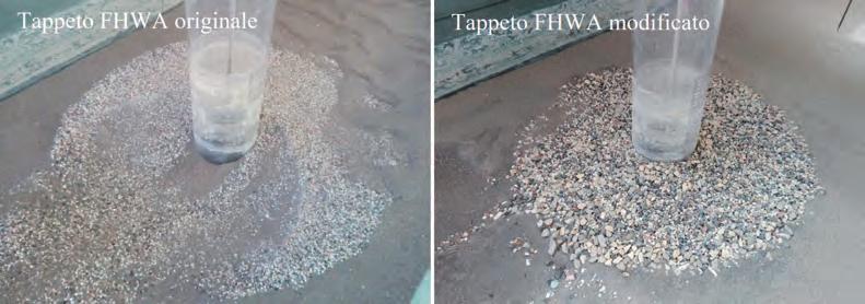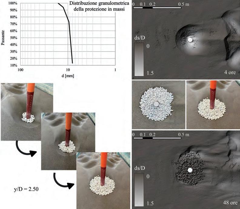corrisponde su prototipo a 0.50 m quando si assuma una scala geometrica del modello 1:50. Tale diametro di scogliera è spesso utilizzato nelle pratiche applicazioni disposto su più strati. L’estensione planimetrica del tappeto antierosione è stata ricavata dall’impronta dello scavo che si realizza dopo 4 ore di sperimentazione. Questo permette di adeguare la dimensione planimetrica dello scavo alle situazioni di scavo geometricamente più complesse, quali quelle legate al caso di pile allungate non allineate con la corrente.