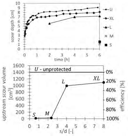 Figura 5.12 Risultati delle sperimentazioni delle protezioni a scogliera sviluppate su pile allungate allineata e inclinata di 15° rispetto la corrente.