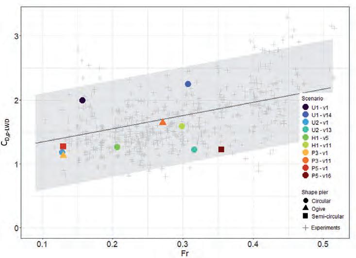 dell’impalcato, utilizzando le sole caratteristiche del moto in condizioni non perturbate, e senza richiedere l’applicazione di alcuno strumento di modellistica avanzata. Il criterio sviluppato, applicabile per tutti i ponti con schema a trave ed elementi strutturali di equivalente geometria esaminata, fornisce indicazioni utili per migliorare la sicurezza dei ponti esistenti in caso di assenza di trasporto solido in alveo. Nell’ottica di contribuire a colmare le limitazioni presenti in letteratura sul tema, l’attività è stata finalizzata alla predisposizione di un supporto pratico-operativo per gli stakeholder e professionisti chiamati a valutare la stabilità dei ponti esistenti, o quella di nuove opere in fase di progettazione. Le curve elaborate possono fungere da riferimento nella verifica della sicurezza dei ponti potenzialmente esposti a carichi idraulici critici, contribuendo in modo significativo alla protezione delle comunità che dipendono da essi per la mobilità e lo sviluppo socioeconomico delle aree interessate dall’uso dell’infrastruttura di trasporto. La metodologia, testata fino qui per una delle tipologie strutturali di ponti esistenti più frequenti, è suscettibile di essere estesa ad altre geometrie (come i ponti ad arco), aumentando l’applicabilità dello strumento operativo ad una gamma più ampia di ponti presenti sul territorio. L’effetto dell’accumulo di detriti intorno alle pile, insieme a quello dell’erosione localizzata alla base delle fondazioni, sulle forze agenti sulla struttura può essere integrato all’interno della procedura, con l’obiettivo di costruire apposite curve sintetiche da adottare in presenza di tali fenomeni. Pertanto, estendere l’esperienza condotta, e qui presentata, con l’inclusione di condizioni di fondo mobile potrebbe condurre a ulteriori risultati, importanti sia per scopi progettuali sia per la valutazione delle vulnerabilità e criticità post-realizzazione.