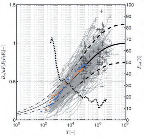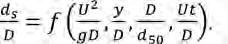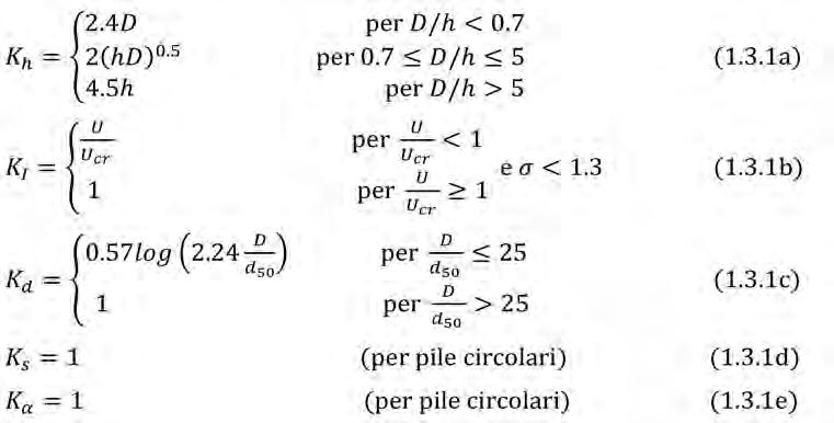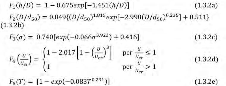 con F1, F2, F3, F4, e F5 fattori moltiplicativi che dipendono dai parametri h/D, D/d50, σ, U/Ucr e T = tU/(DΔ0.5) tempo adimensionale, con Δ = (ρs -ρ)/ρ, ρs e ρ le densità del materiale di fondo e dell’acqua, rispettivamente, e σ il coefficiente di uniformità del materiale di fondo. Di seguito si esplicitano le espressioni dei fattori moltiplicativi dell’Eq. (1.3.2):