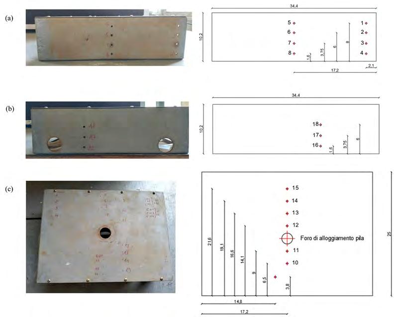 Fig. 1.2.5 Foto e rappresentazione schematica del deck 1 con indicazione del posizionamento delle prese di pressione: vista (a) da monte, (b) da valle e (c) dal basso.