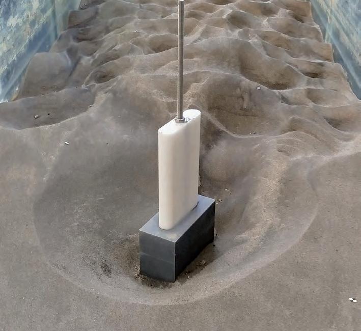 Altre sperimentazioni sono state sviluppate per comprendere gli effetti sullo scavo localizzato legati alla presenza della fondazione alla base delle pile allungate. Tutte le prove sono state svolte in condizioni di acque chiare, ovvero caratterizzate da velocità inferiori a quella critica (U = 0.9 Uc), esplorando gli effetti legati a diversi valori del tirante (circa 0.05 < y < 0.15 m) e del diametro delle pile circolari (0.05 < D < 0.16 m). La geometria di pila allungata analizzata ha fronti arrotondati e dimensioni 0.05 × 0.20 m2: gli esperimenti sono stati condotti con pila allineata rispetto la corrente, oltre che inclinata di 15° e 30°. Sono state considerate due diverse tipologie di protezione a scogliera attorno alle pile: i tappeti, caratterizzati da spessore proporzionale al diametro della stessa scogliera, e la configurazione a tronco di piramide rovescia che si ottiene riempiendo lo scavo che si forma in occasione delle piene. La capacità dei sensori sonar di monitorare l’evoluzione dello scavo è stata sperimentata in quattro diverse posizioni attorno ad una pila allungata con plinto di fondazione 0.13 × 0.28 m2 inclinata di 30° rispetto la corrente. In alcuni casi ci si è avvalsi di modelli di turbolenza LES sviluppati tramite l’uso del codice FLOW-3D® per il confronto dei risultati.