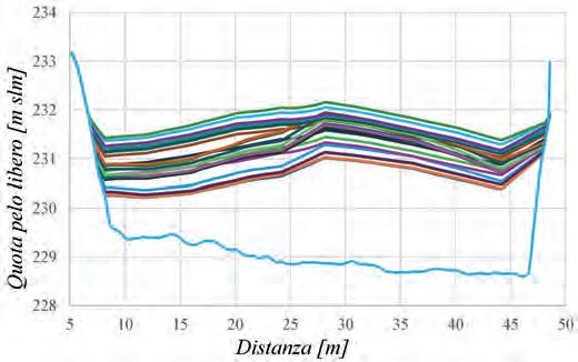 nei quali il flusso nell’alveo principale è in condizioni di live-bed. In queste condizioni, la profondità di erosione oscilla attorno a un valore medio e, dato che la portata varia nel tempo secondo un idrogramma di piena, può essere maggiore di quella stimata per una certa portata in condizioni stazionarie. L’aumento di profondità di erosione legato alla non stazionarietà del flusso appare minore dell’incertezza attualmente insita nella stima dello scavo. Nelle parti periferiche del corso d’acqua, dove il trasporto di sedimenti è debole, i risultati del presente progetto dimostrano la possibile efficacia di sistemi di protezione basati su georeti. L’accumulo di materiale flottante ai ponti è fortemente influenzato dal numero di Froude della corrente, dato che per bassi valori di Froude il materiale flottante si accumula completamente a monte dell’impalcato creando una sorta di zattera di spessore limitato, mentre per Froude maggiori si instaura una dinamica di accumulo e distruzione dell’ammasso, che raggiunge anche profondità considerevoli rispetto alla profondità della corrente. Con Froude intorno a 0.3 l’accumulo può arrivare a determinare un raddoppio del rigurgito. Il numero di Froude e il grado di ostruzione determinato dall’accumulo del materiale flottante hanno influenza significativa sul coefficiente di drag ammasso, che viceversa non risulta dipendere dalla forma né dalla densità dell’ammasso stesso. Comunque, nella valutazione delle forze esercitate da una corrente su accumuli di detriti la maggiore incertezza risiede nella previsione della dimensione dell’ammasso, mentre l’incertezza sul valore del coefficiente di forza può essere considerata come secondaria.