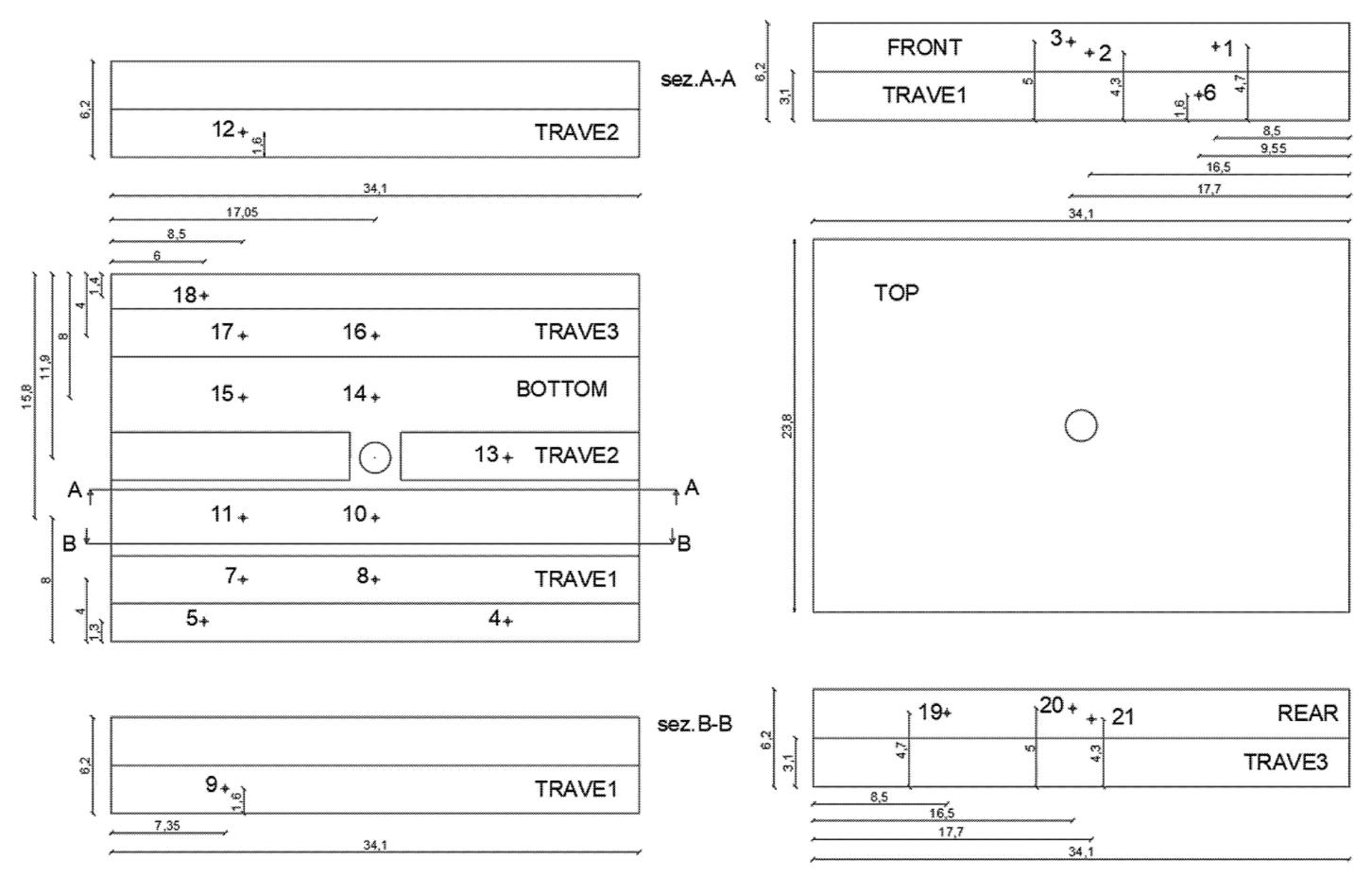 Fig. 1.2.7 Rappresentazione schematica del deck 2 con indicazione del posizionamento delle prese di pressione.