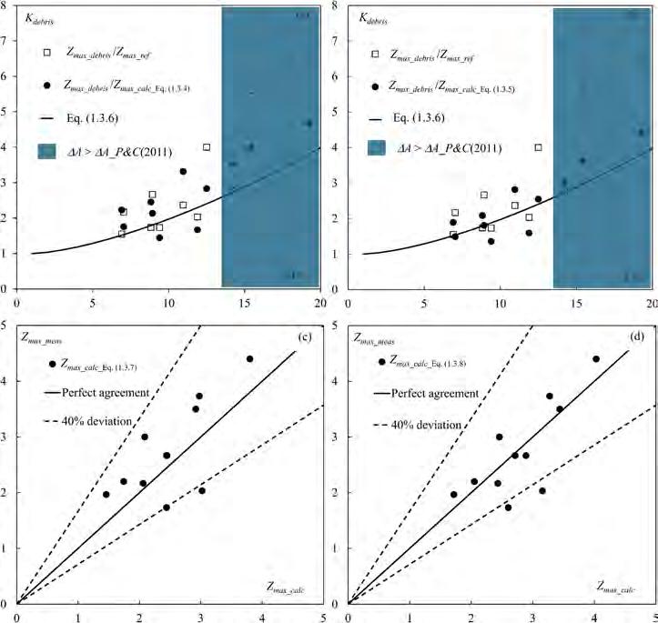 Il secondo step dell’analisi ha invece riguardato la generalizzabilità del legame funzionale espresso dalla (1.3.6), qualora Kdebris venga assunto quale ulteriore fattore moltiplicativo nelle relazioni (1.3.4) e (1.3.5). A tal fine, nelle Figure (1.3.2)a-b, sono stati riportati i valori di Kdebris ottenuti dividendo Zmax_debris e quelli corrispondenti valutati con l’Eq. (1.3.4) (Zmax_calc_Eq. (1.3.4), Figura 1.3.2a) e l’Eq. (1.3.5) (Zmax_calc_Eq. (1.3.5), Figura 1.3.2b).