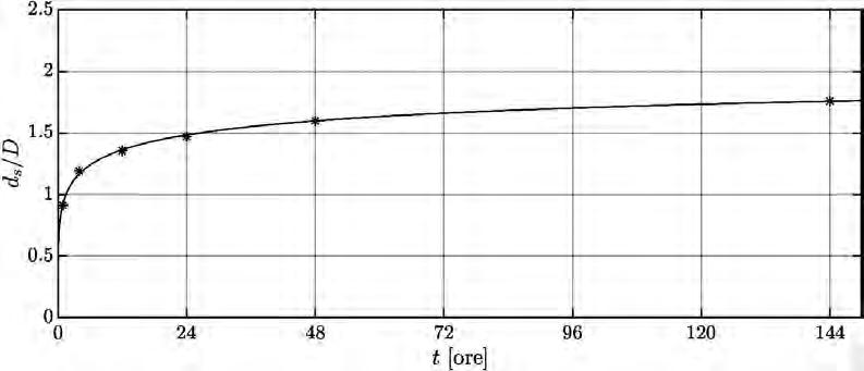 prezzabili dal punto di vista pratico, sempre ammesso che nella sperimentazione siano mantenute le condizioni di stazionarietà delle varie grandezze in gioco. Si tratta comunque di prove di lunga durata, tanto maggiore quanto minore è la dimensione del materiale utilizzato nelle sperimentazioni: giorni nei casi sperimentati a Padova, dove sono state utilizzate sabbie medio-fini (d50 = 0.35 mm) per riprodurre il fondo alveo del canale. Un esempio dell’andamento nel tempo della profondità di scavo è riportato in Figura 5.5, dalla quale risulta come il protrarre fino a 144 ore (6 giorni) le sperimentazioni rappresenti un buon compromesso tra la durata della prova e il raggiungimento di una condizione di quasi equilibrio dello scavo.