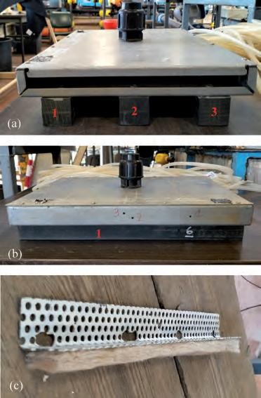– Deck 2 (Figure 1.2.6 e 1.2.7): in lamiera d’acciaio al quale sono state fissate 3 travi e dotato di 21 prese di pressione che svolgono la stessa funzione descritta per il Deck 1. In alcuni test speciali, per simulare la presenza della barriera stradale (guardrail) è stata realizzata una lamiera forata in acciaio che può essere avvitata all’estradosso del deck lato monte. Inoltre, sempre in tali test speciali, è stata testata anche una tipologia di debris, costituita da una striscia di materiale impermeabile che viene fissato sulla lamiera forata. In entrambi i canali, i test, durati circa t = 2 ore, hanno raggiunto generalmente una configurazione di (quasi) equilibrio. L’evoluzione della profondità massima di erosione è stata monitorata sia con una scala graduata verticale incollata alla pila che con idrometro manuale. Al termine della prova, il fondo è stato rilevato sia con idrometro manuale che con uno scanner laser