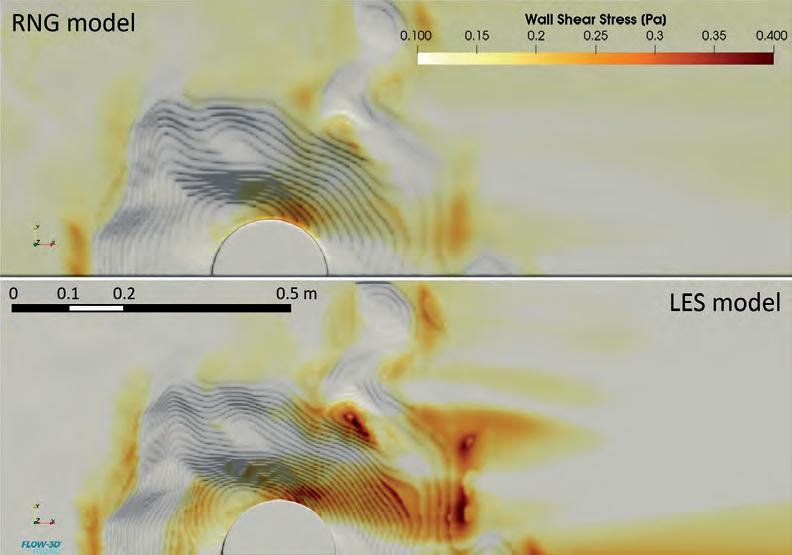 Quale modello numerico è stato utilizzato il codice FLOW-3D, confrontando preliminarmente i risultati in termini di tensioni tangenziali di modelli di turbolenza RNG e LES per il quale la geometria del fondo era stata acquisita mediante rilievo fotogrammetrico. Dalla Figura 5.15 appare evidente come solo il modello LES restituisce sforzi tangenziali nello scavo superiori al valore limite di 0.21 Pa, coerentemente con la non raggiunta condizione di equilibrio nel modello fisico.