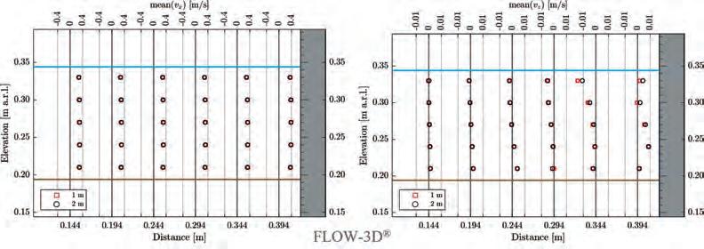 Nella Figura 5.16 è illustrato il confronto tra le misure di velocità longitudinali e verticali ADV e quelle risultanti dal modello LES in una sezione in asse alla pila e parallela alla corrente. Pur non essendo perfetta la corrispondenza anche per difficoltà nello sviluppo delle misu-