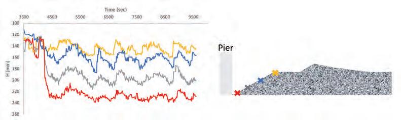 Le prove hanno preso in considerazione sia pile circolari che pile allungate con fronti arrotondati, disponendo in prima istanza la scogliera su due strati e sviluppando in clear water prove della durata di 48 ore. Mentre per le pile di geometria circolare, la scogliera ha mostrato una configurazione ancora stabile dopo 48 ore di durata dell’esperimento, non altrettanto può dirsi per la pila di tipo allungato come si vede dalla Figura 5.12.