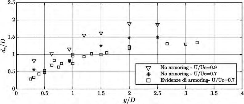 In Figura 5.7 sono riportati a confronto i valori di scavo massimo ottenuti per una velocità U/Uc = 0.7, distinguendo tra quelli dove risulta evidente la presenza di armoring e quelli dove è invece assente.
