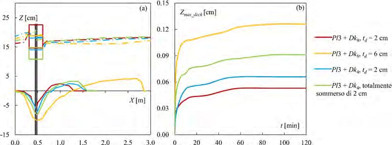 Per quanto concerne il fenomeno erosivo in presenza di deck parzialmente o totalmente sommersi, vi è da rilevare che l’effetto del parametro ΔA è sostanzialmente simile a quanto evidenziato in precedenza per i debris. Nella fattispecie, lo scavo massimo risulta essere una funzione monotona crescente del parametro ΔA. Inoltre, anche la cinetica dello scavo subisce una significativa accelerazione all’aumentare di ΔA. In Figura 1.3.3 si riportano alcuni selezionati esempi di profili longitudinali al termine degli esperimenti (Figura 1.3.3a) e di curve evolutive dello scavo massimo (Zmax_deck) (Figura 1.3.3b).