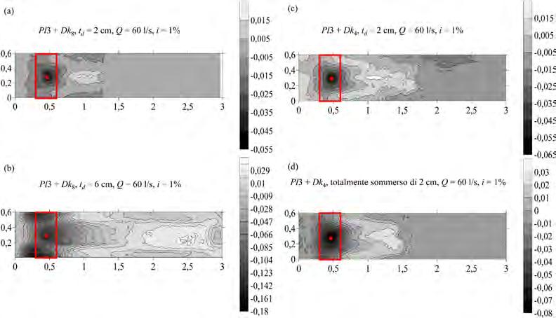 Fig. 1.3.4 Mappe morfologiche all’equilibrio: (a) test con pila Pl3, deck Dk8 e sommergenza td = 2 cm; (b) test con pila Pl3, deck Dk8 e sommergenza td = 6 cm; (c) test con pila Pl3, deck Dk4 e sommergenza td = 2 cm; (d) test con pila Pl3, deck Dk4, totalmente sommerso di 2 cm. I dati sperimentali si riferiscono ad alcuni test selezionati condotti con portata Q = 60 l/s e pendenza del fondo i = 1%.